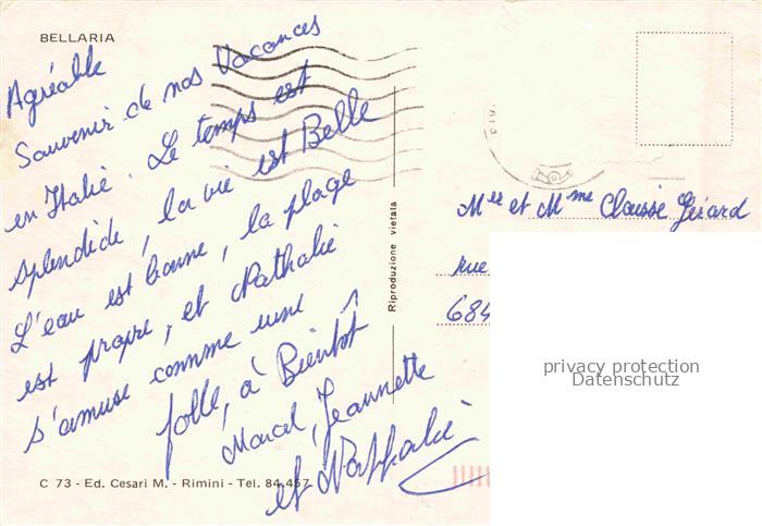 74029135 old postcard Bellaria Rimini IT Strand Hotels postalisch gelaufen Erhaltung siehe scans [FriedD77] KatCode: 11240