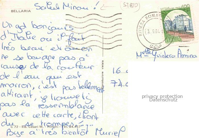 74043238 old postcard Bellaria Rimini IT Strand Hotels postalisch gelaufen Erhaltung siehe scans [WerneD78] KatCode: 11240
