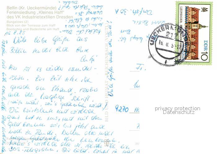 72652005 alte Postkarte Bellin Ueckermuende Feriensiedlung Kleines Haff Bungalows Bootssteg Badestelle postalisch gelaufen Erhaltung siehe scans [FriedD77] KatCode: 11110013062059