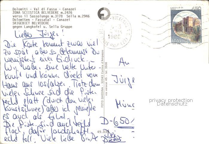 12432665 carte postale Belvedere Alpes-Maritimes Skigebiet Dolomiten Fassatal Canazei Langkofel und Sellagruppe postalisch gelaufen Erhaltung siehe scans KatCode: 11170006206013