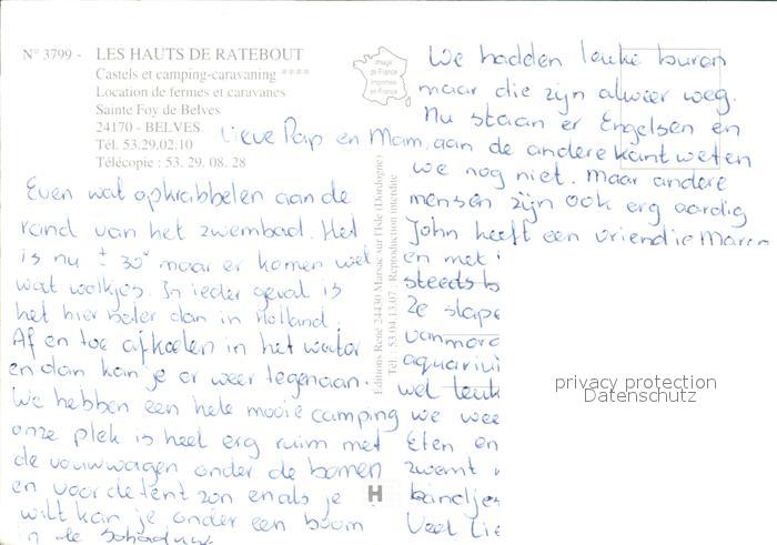 12495794 carte postale Belves Dordogne Les Hauts de Ratebout Schwimmbad Gaststube Tennisplaetze Park postalisch gelaufen Erhaltung siehe scans KatCode: 11170024424035