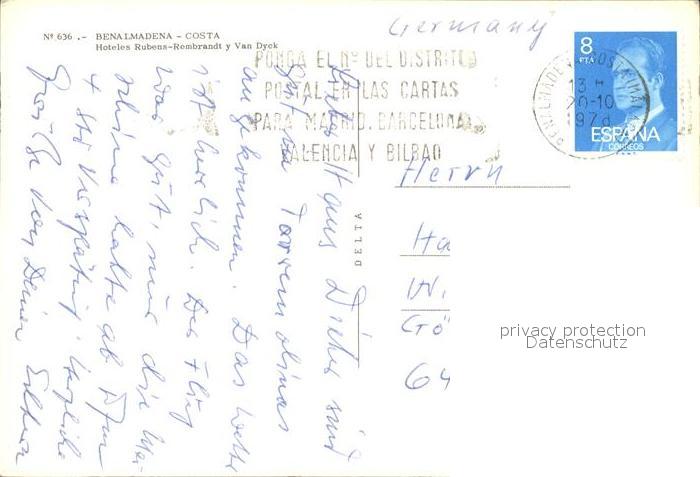 old postcard Benalmadena Costa Hotels Rubens Rembrandt y Van Dyck postalisch gelaufen Erhaltung siehe scans