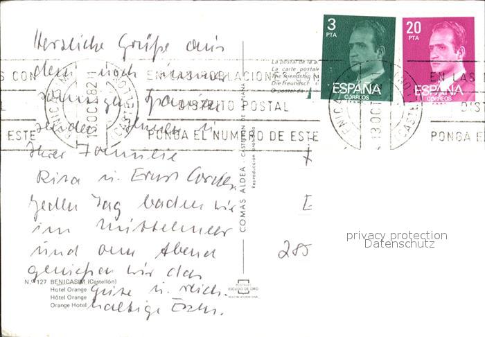 old postcard Benicasim Hotel Orange postalisch gelaufen Erhaltung siehe scans [LiesaD40 kt120box]