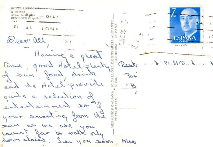 73899244 old postcard Benidorm ES Hotel Las Ocas Piscina postalisch gelaufen Erhaltung siehe scans [FriedD77] KatCode: 11510