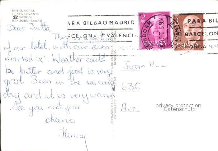 old postcard Benidorm Hotel Coral postalisch gelaufen Erhaltung siehe scans