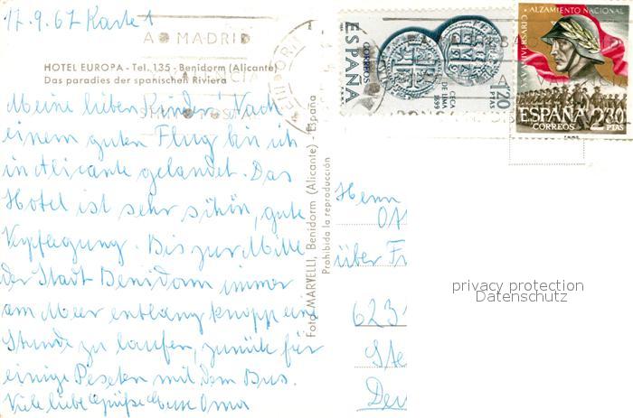 13252891 Benidorm Hotel Europa postalisch gelaufen Erhaltung siehe scans [NatalD47] old postcard Nata Katcode 11510
