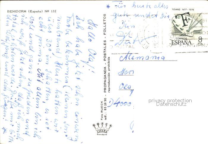 old postcard Benidorm Promenade Palmen Strand Rosen postalisch gelaufen Erhaltung siehe scans