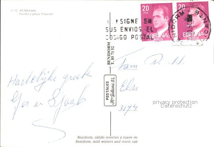 old postcard Benidorm Puerto y playa Poniente Fregatten postalisch gelaufen Erhaltung siehe scans