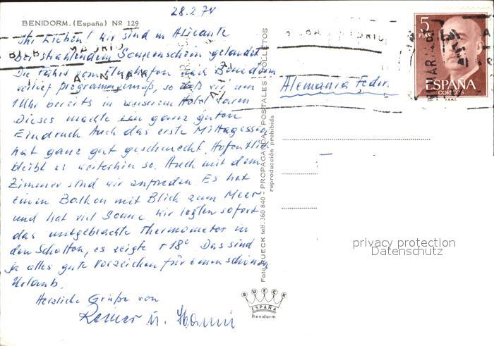 old postcard Benidorm Teilansicht Palmenallee postalisch gelaufen Erhaltung siehe scans