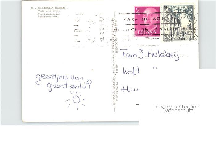 old postcard Benidorm Trachtentraeger Flamengotaenzer Gesamtansicht postalisch gelaufen Erhaltung siehe scans