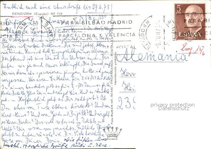 old postcard Benidorm Vista general Playa Hotel Strand postalisch gelaufen Erhaltung siehe scans