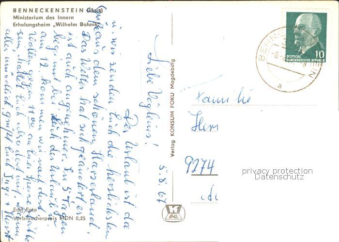 72008357 alte Postkarte Benneckenstein Erholungsheim Wilhelm Bahnik postalisch gelaufen Erhaltung siehe scans KatCode: 11110015085045