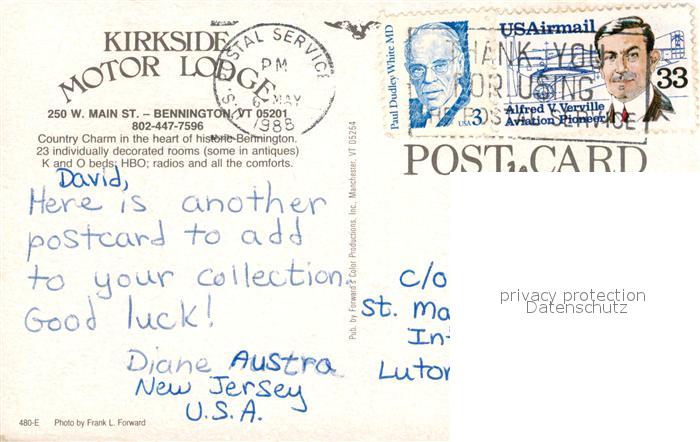 73080016 old postcard Bennington Vermont Kirkside Motor Lodge postalisch gelaufen Erhaltung siehe scans [FriedD77] KatCode: 14140480000000