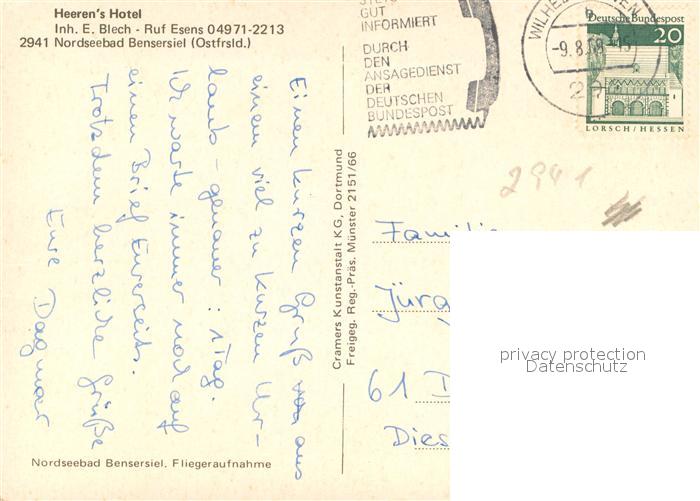 73746950 alte Postkarte Bensersiel Fliegeraufnahme Heerens Hotel postalisch gelaufen Erhaltung siehe scans [LiesaD40] KatCode: 11110003462003