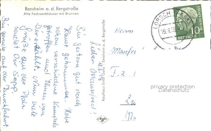 72101017 alte Postkarte Bensheim Bergstrasse Alte Fachwerkhaeuser mit Brunnen postalisch gelaufen Erhaltung siehe scans KatCode: 11110006431002