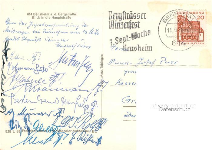 73763319 alte Postkarte Bensheim Bergstrasse Blick in die Hauptstrasse mit Brunnen postalisch gelaufen Erhaltung siehe scans [WerneD78] KatCode: 11110006431002