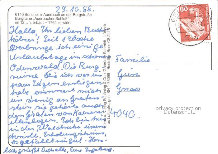 71909584 alte Postkarte Bensheim Bergstrasse Fliegeraufnahme Burgruine Auerbacher Schloss postalisch gelaufen Erhaltung siehe scans KatCode: 11110006431002