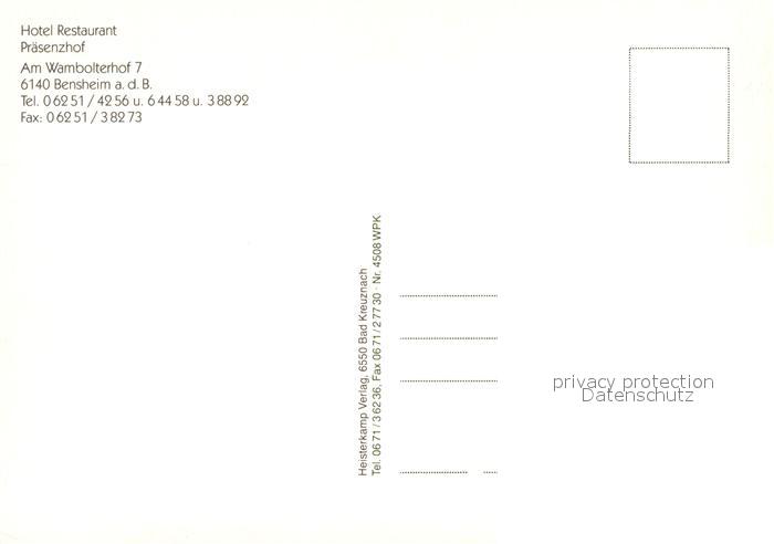 73660996 Bensheim Bergstrasse Hotel Restaurant Praesenzhof postalisch nicht gelaufen Erhaltung siehe scans [FriedD77] KatCode: 11110006431002