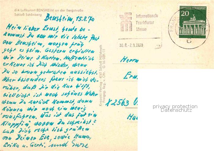 72878580 alte Postkarte Bensheim Bergstrasse Luftkurort Schloss Schoenberg Fliegeraufnahme postalisch gelaufen Erhaltung siehe scans [FriedD77] KatCode: 11110006431002