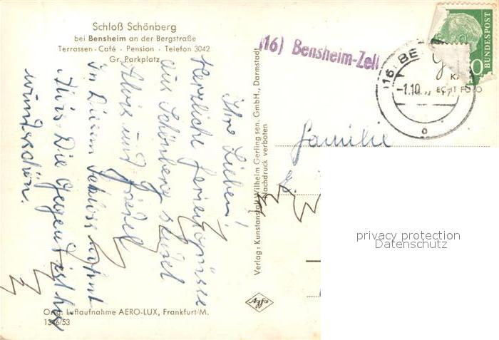 72939057 alte Postkarte Bensheim Bergstrasse Schloss Schoenberg Fliegeraufnahme postalisch gelaufen Erhaltung siehe scans [NatalD47] KatCode: 11110006431002