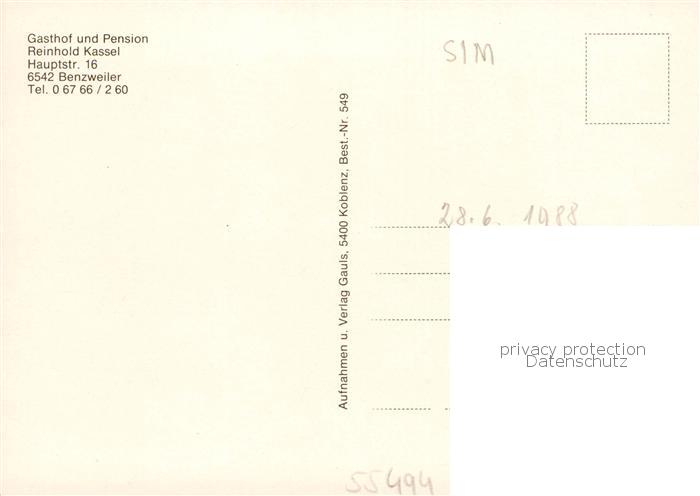 73801921 Benzweiler Gasthof Pension Reinhold Kassel postalisch nicht gelaufen Erhaltung siehe scans [WerneD78] KatCode: 11110007140011