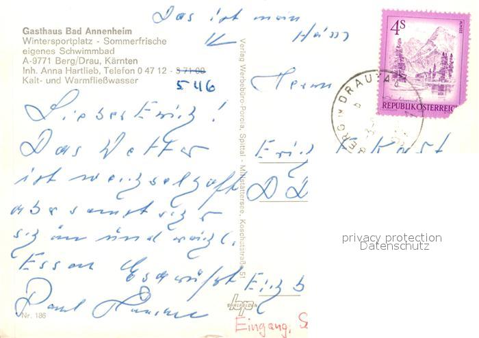 13191567 alte Postkarte Berg Drautal Gasthaus Bad Annenheim postalisch gelaufen Erhaltung siehe scans [PaolaD17] KatCode: 11390212020603
