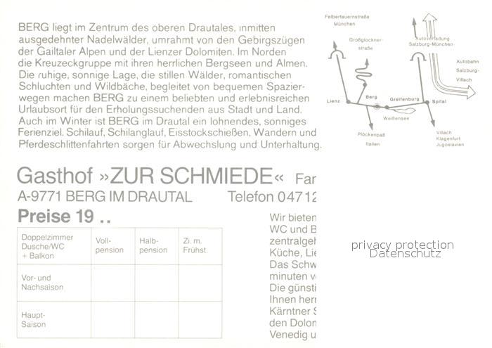 73588154 Berg Drautal Gasthof Zur Schmiede Fremdenzimmer Gastraum Blick zur Kirche postalisch nicht gelaufen Werbekarte (keine Postkarte) Erhaltung siehe scans [FriedD77] KatCode: 11390212020603