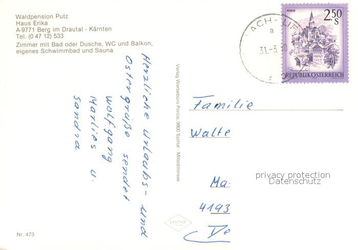 73631234 alte Postkarte Berg Drautal Waldpension Putz postalisch gelaufen Erhaltung siehe scans [WerneD78] KatCode: 11390212020603