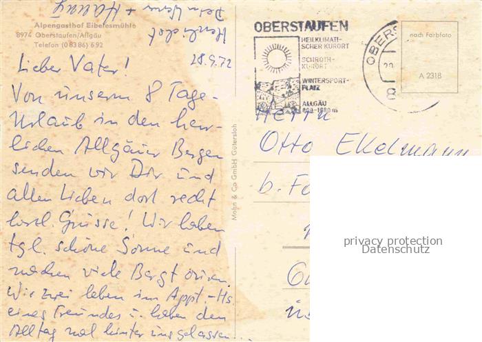 74157697 alte Postkarte Berg Oberstaufen Alpengasthof-Eibelehmuehle Terrasse Garten Liegestuehle Sonnenschirm Wald Wiesen Allgaeu postalisch gelaufen Erhaltung siehe scans [Karloger] KatCode: 11110009780132