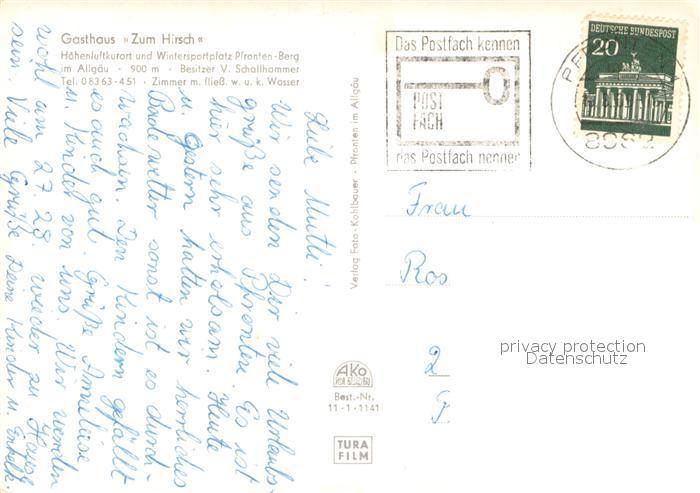 73644495 alte Postkarte Berg Pfronten Gasthof Pension Zum Hirsch Ortsmotiv mit Kirche Alpen postalisch gelaufen Erhaltung siehe scans [FriedD77] KatCode: 11110009777159