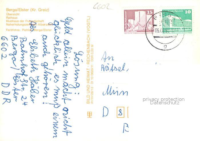 73650115 alte Postkarte Berga Elster Panorama Rathaus Klubhaus der Freundschaft Naherholungszentrum Albersdorf postalisch gelaufen Erhaltung siehe scans [WerneD78] KatCode: 11110016076004