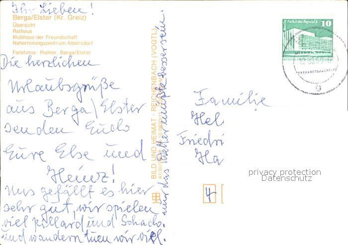 72423617 alte Postkarte Berga Elster Panorama Rathaus Klubhaus Freundschaft Naherholungszentrum Albersdorf postalisch gelaufen Erhaltung siehe scans KatCode: 11110016076004