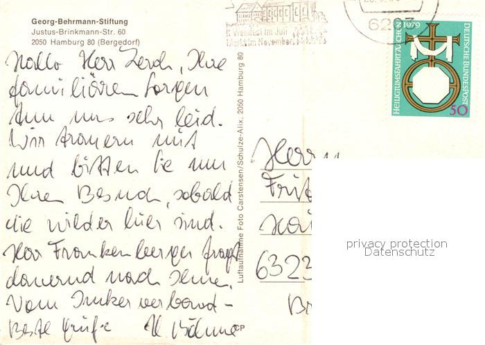73156591 alte Postkarte Bergedorf Hamburg Georg Behrmann Stiftung Fliegeraufnahme postalisch gelaufen Erhaltung siehe scans [FriedD77] KatCode: 11110002000000
