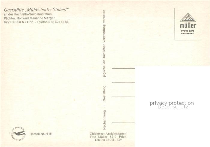 73653341 Bergen Chiemgau Gaststaette Muehlwinkler Stueberl Gipfelkreuz Hochfelln Seilbahn Gaststube postalisch nicht gelaufen Erhaltung siehe scans [WerneD78] KatCode: 11110009189113