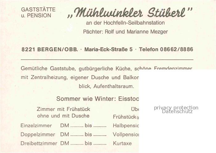 74021053 Bergen Chiemgau Gaststaette Pension Muehlwinkler Stueberl an der Hochfelln-Seilbahnstation postalisch nicht gelaufen Werbekarte (keine Postkarte) Erhaltung siehe scans [FriedD77] KatCode: 11110009189113