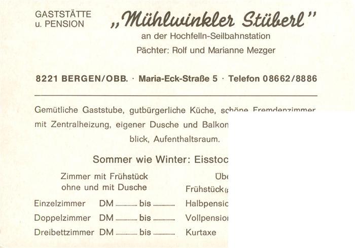 73942417 Bergen Chiemgau Gaststaette Pension Muehlwinkler Stueberl postalisch nicht gelaufen Werbekarte (keine Postkarte) Erhaltung siehe scans [FriedD77] KatCode: 11110009189113
