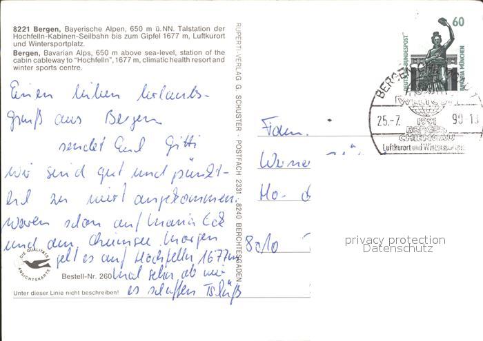 72372366 alte Postkarte Bergen Chiemgau Hochfelln Bergbahn Chiemsee Gasthof Pattenberg Bernhaupten Schwimmbad Bayerische Alpen postalisch gelaufen Erhaltung siehe scans KatCode: 11110009189113