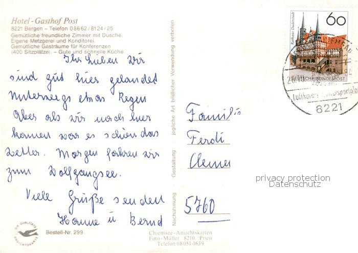 73857445 alte Postkarte Bergen Chiemgau Hotel Gasthof zur Post postalisch gelaufen Erhaltung siehe scans [WerneD78] KatCode: 11110009189113