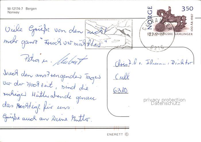old postcard Bergen Norwegen Teilansichten Brunnen postalisch gelaufen Erhaltung siehe scans