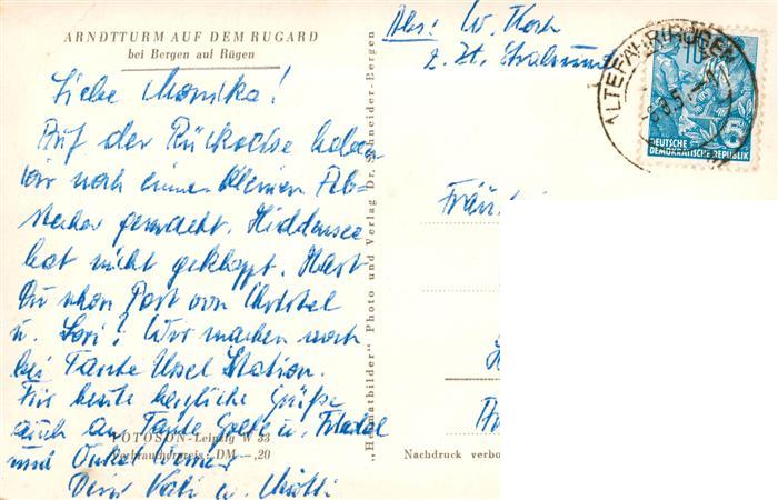 73904032 Bergen Ruegen Arndtturm auf dem Rugard postalisch gelaufen Erhaltung siehe scans [WerneD78] alte Postkarte Wern Katcode 11110013061004
