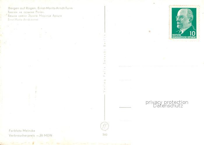 73015283 alte Postkarte Bergen Ruegen Ernst Moritz Arndt Turm postalisch gelaufen Erhaltung siehe scans [WerneD78] KatCode: 11110013061004