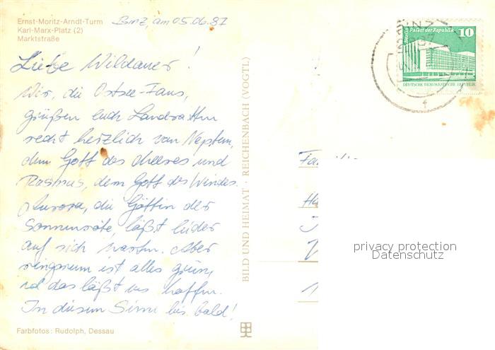 73123299 alte Postkarte Bergen Ruegen Ernst Moritz Arndt Turm Karl Mark Platz Marktstrasse postalisch gelaufen Erhaltung siehe scans [KathaD81] KatCode: 11110013061004