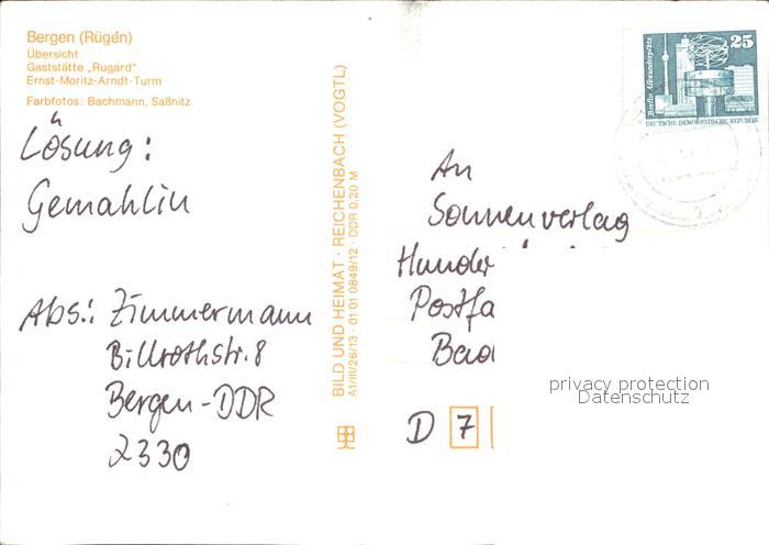 72416177 alte Postkarte Bergen Ruegen Gaststaette Rugard Ernst Moritz Arndt Turm postalisch gelaufen Erhaltung siehe scans KatCode: 11110013061004
