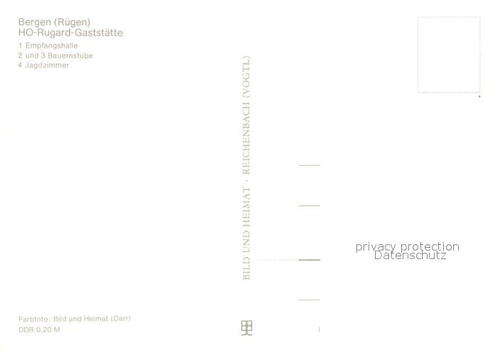 73653066 Bergen Ruegen HO Rugard Gaststaette Empfangshalle Bauernstube Jagdzimmer postalisch nicht gelaufen Erhaltung siehe scans [WerneD78] KatCode: 11110013061004