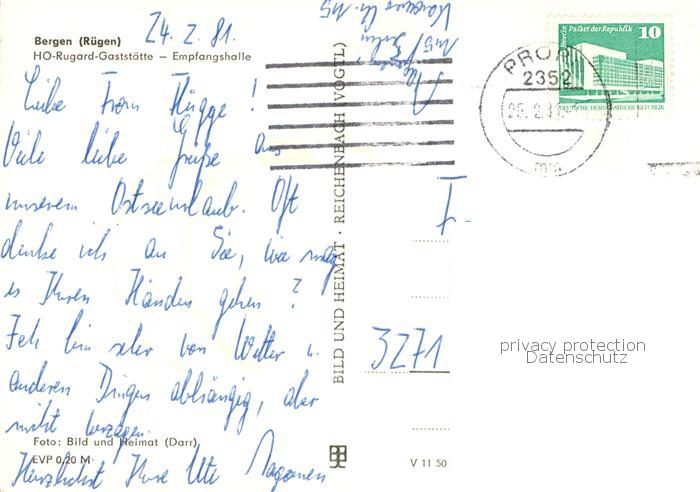 73777580 alte Postkarte Bergen Ruegen HO Rugard Gaststaette Empfangshalle postalisch gelaufen Erhaltung siehe scans [FriedD77] KatCode: 11110013061004