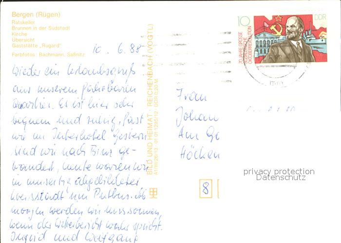 72353766 alte Postkarte Bergen Ruegen Ratskeller Brunnen Suedstadt Kirche Gaststaette postalisch gelaufen Erhaltung siehe scans KatCode: 11110013061004