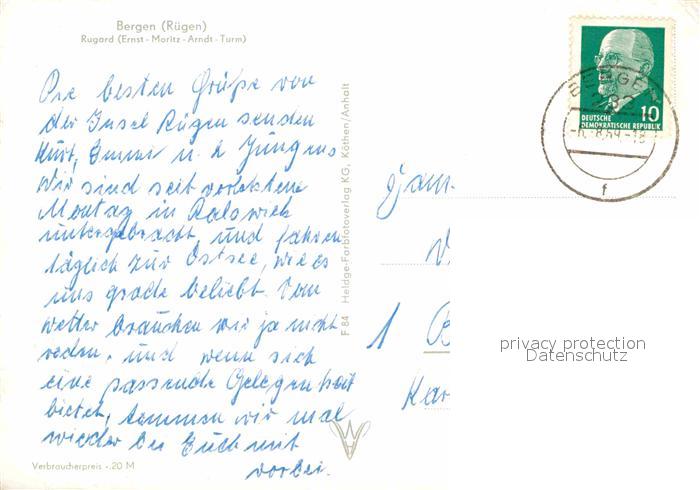 72837429 alte Postkarte Bergen Ruegen Rugard Ernst-Moritz-Arndt-Turm postalisch gelaufen Erhaltung siehe scans [NatalD47] KatCode: 11110013061004