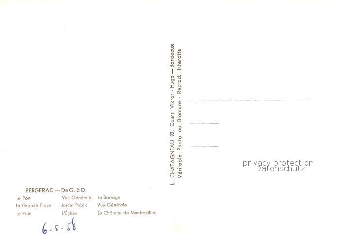 13814257 Bergerac Le Pont La Grande Place Vue generale Jardin Public l’Eglise Le Barrage Vue generale Le Chateau de Mombazillac postalisch nicht gelaufen Erhaltung siehe scans [WerneD78] Wern Katcode 11170024124037