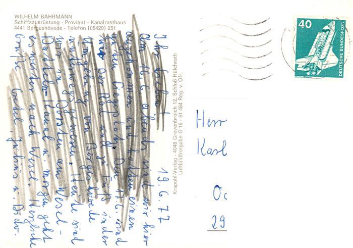73942339 alte Postkarte Bergeshoevede Fliegeraufnahme Bahrmann Schiffsausruestung postalisch gelaufen Erhaltung siehe scans [FriedD77] KatCode: 11110005566016