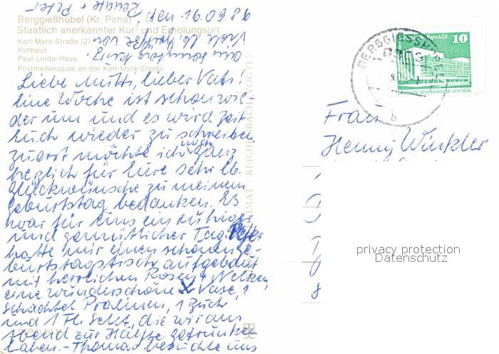 72647449 alte Postkarte Berggiesshuebel Karl Marx Str Postmeilensaeule Kurhaus Paul Linde Haus postalisch gelaufen Erhaltung siehe scans [WerneD78] KatCode: 11110014287015